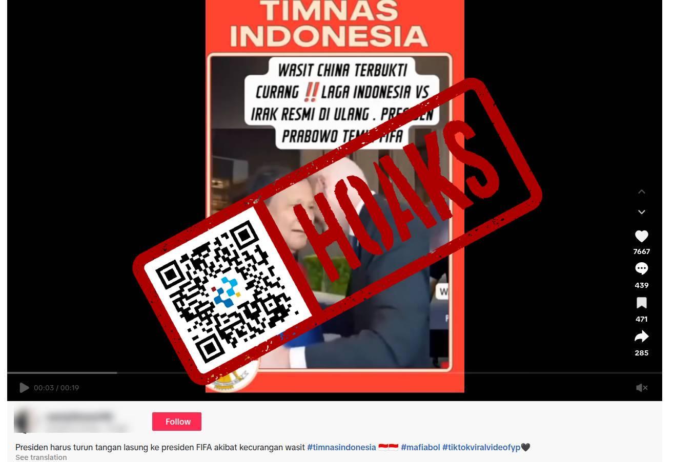 [HOAKS] Laga Indonesia vs Iraq Resmi Diulang, Presiden Prabowo Temui Presiden FIFA